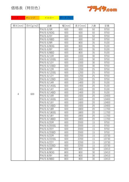 | 幅 (mm) | 長さ (mm) | 入数 (枚) | カラー(特別色) | |||