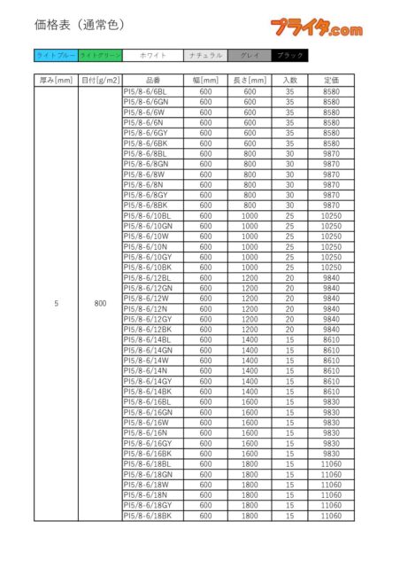 | 幅 (mm) | 長さ (mm) | 入数 (枚) | カラー(通常色) | |||||
