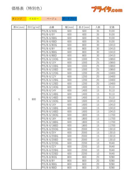 | 幅 (mm) | 長さ (mm) | 入数 (枚) | カラー(特別色) | |||
