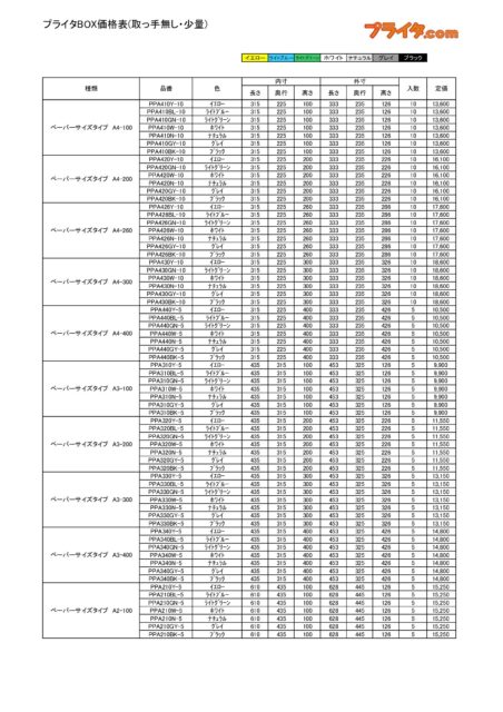 | サイズ | 内寸(mm) | 外寸(mm) | 入数 (枚) | カラー | ||||||||||
